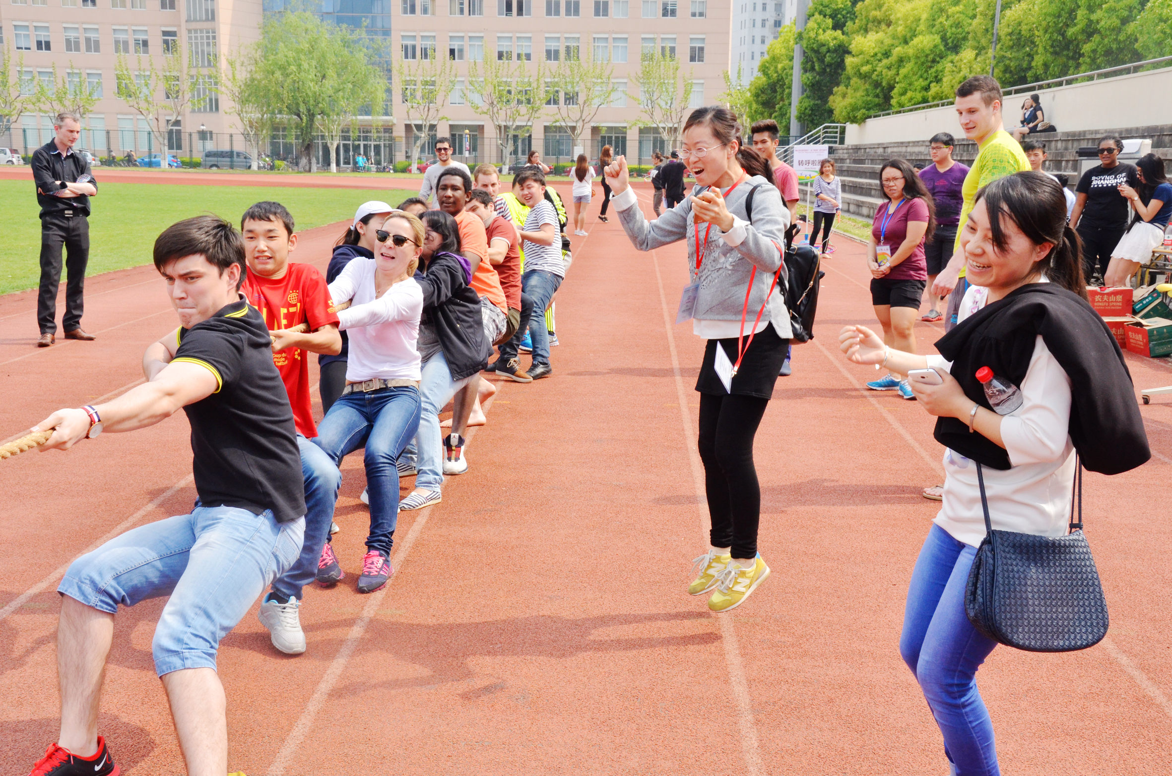 体育节由吴小军副院长主持,介绍了裁判员和比赛项目。比赛设置了集体拔河、跳长绳、呼啦圈以及个人跳绳四个项目。整场比赛,各参赛队员遵循“友谊第一、比赛第二”的体育作风。最后由A1-5&A1-6联队和A1+-2& A1+-3联队分别获得跳长绳和集体拔河冠军。