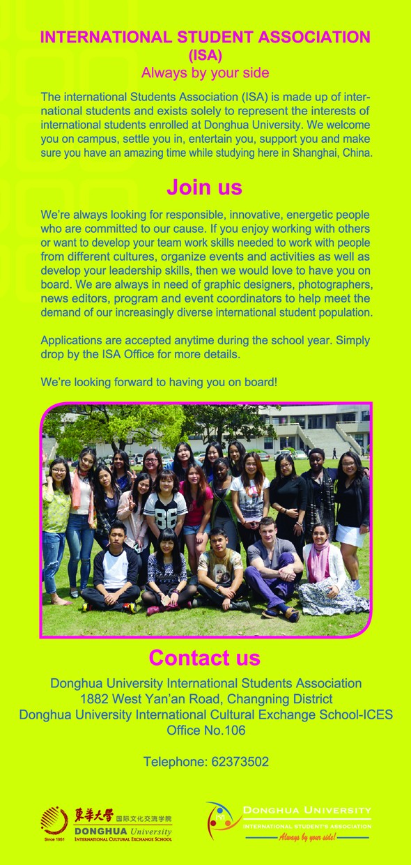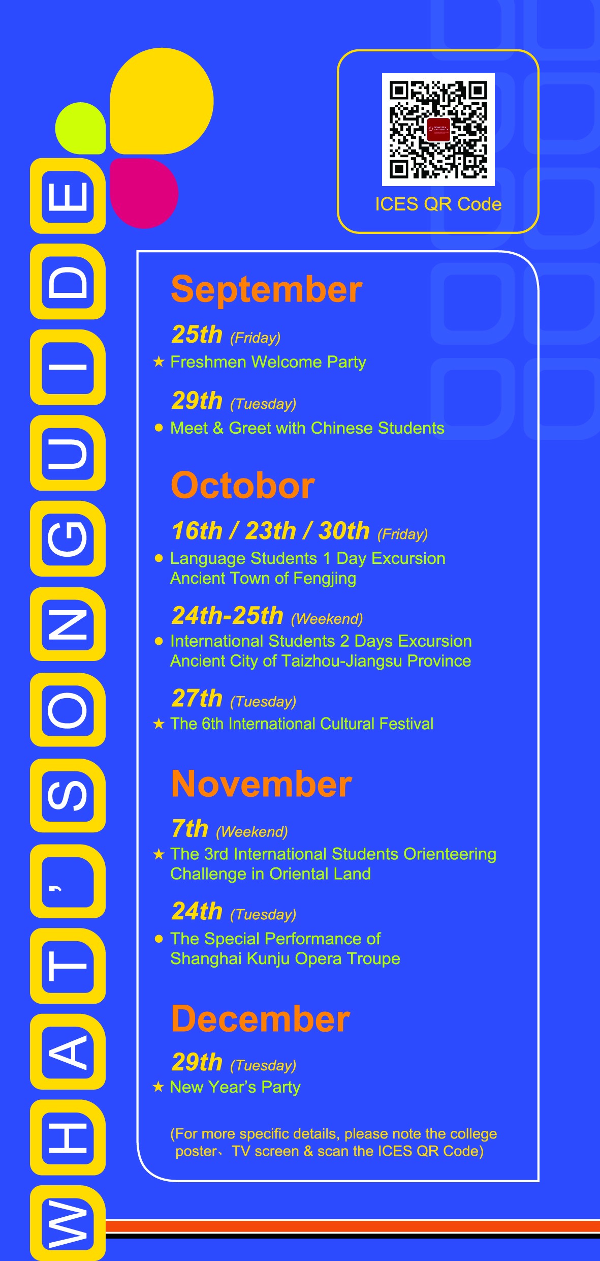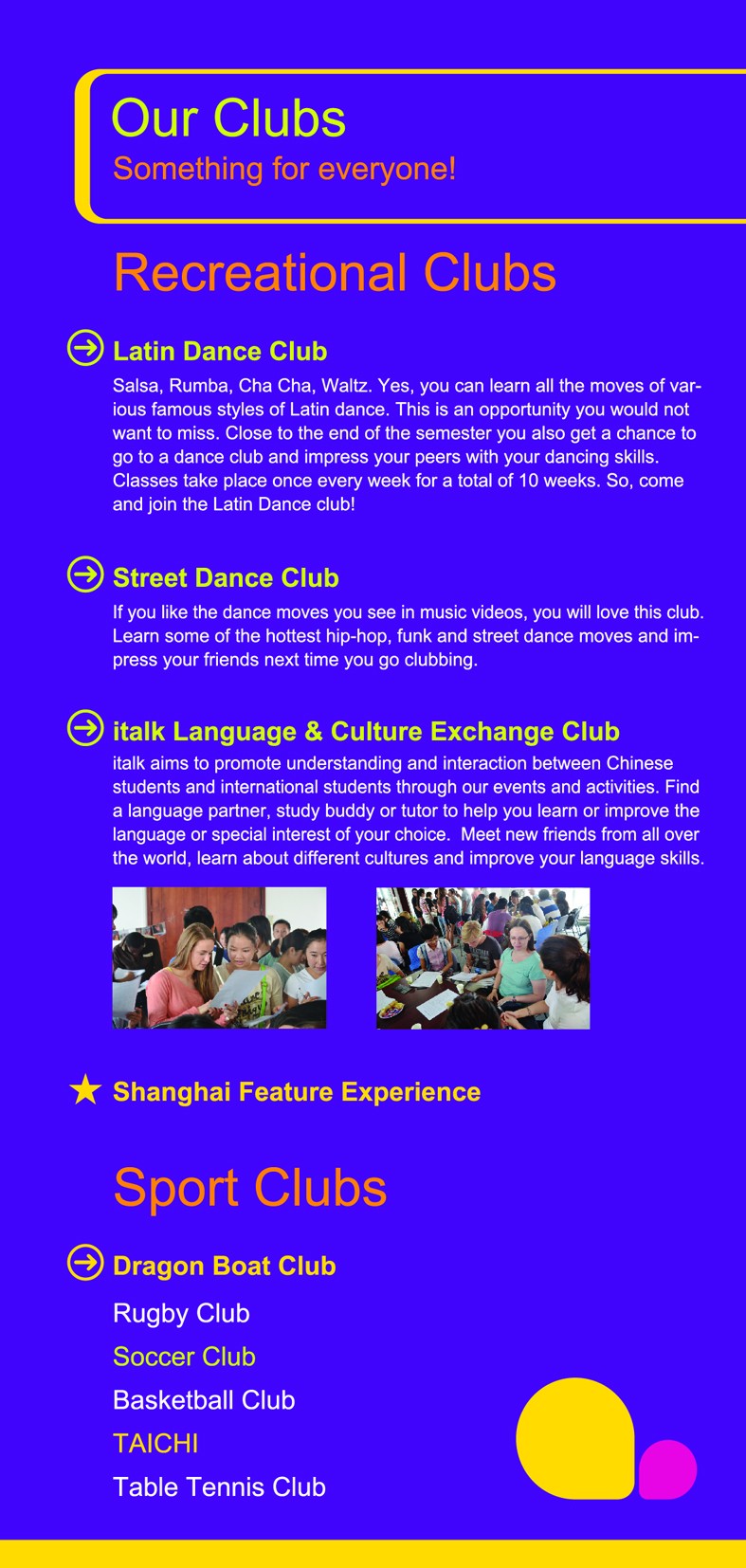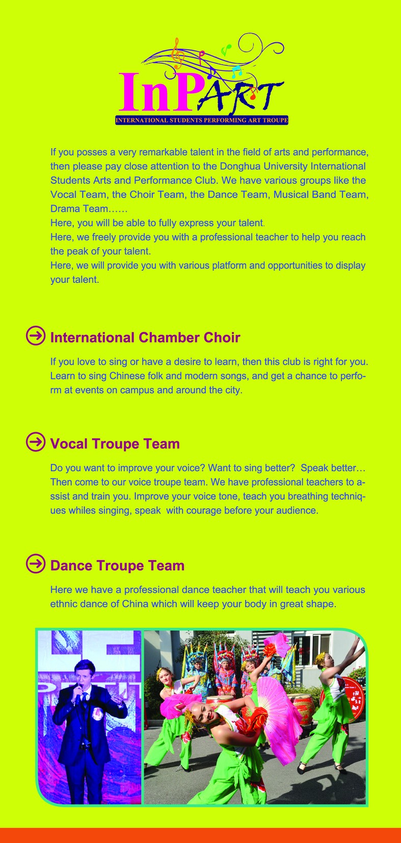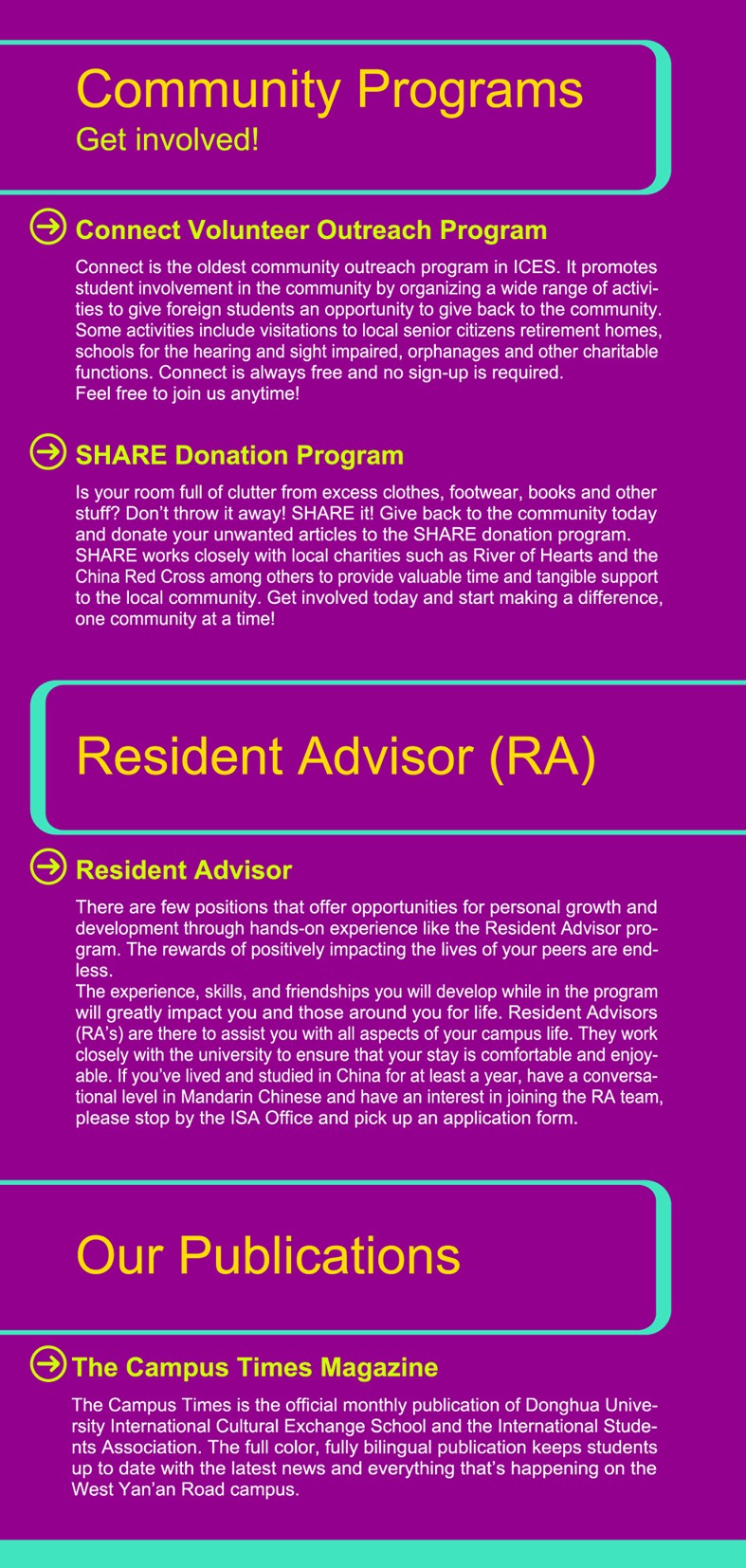 Welcome to join events, clubs, community programs, performance art troupe and International Student Association (ISA) !