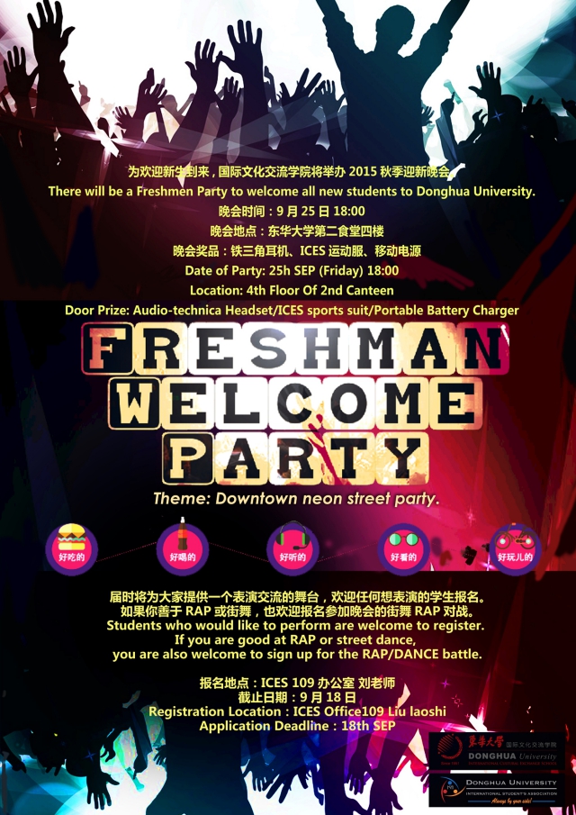 Date: 25th Sept. (Friday) 18:00 Location: 4th Floor of 2nd Canteen (site 21 on ICES map) Students who'd like to perform are welcome to register. If you are good at RAP or street dance, you are also welcome to sign up for the RAP/DANCE battle.Deadline: 18th Sept. Location: ICES Office109 Liu laoshi |