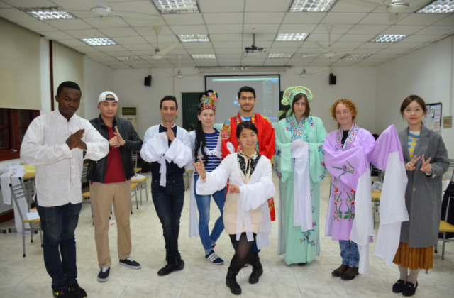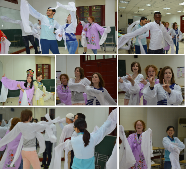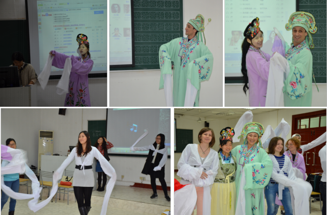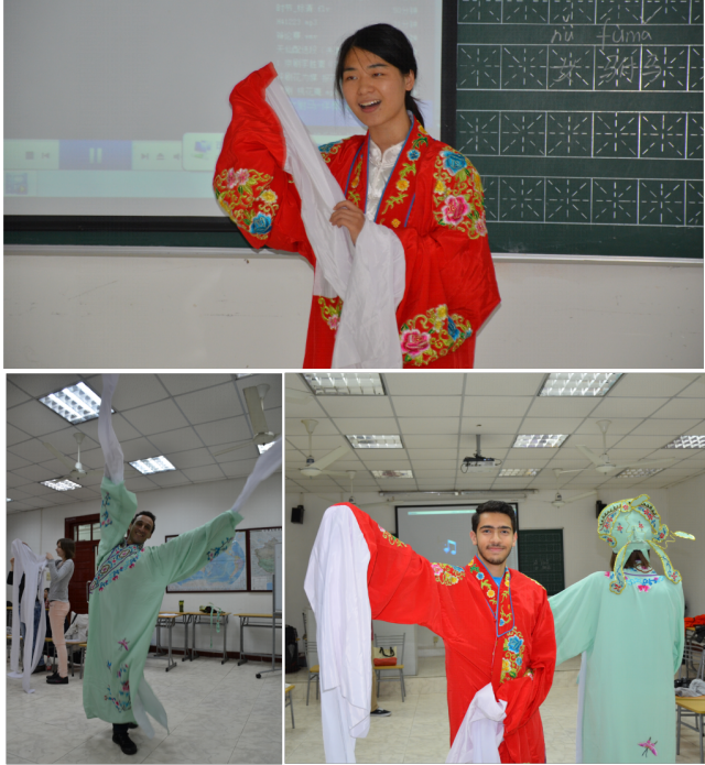 李老师首先和几位“留学生模特” 、“教师模特“一起,给同学们示范了中国戏曲五大主要剧种的名剧名段。