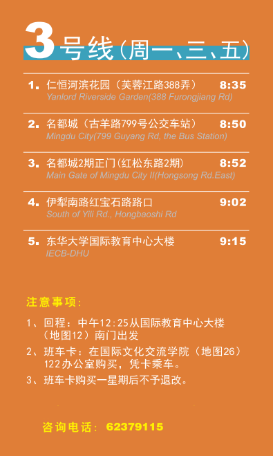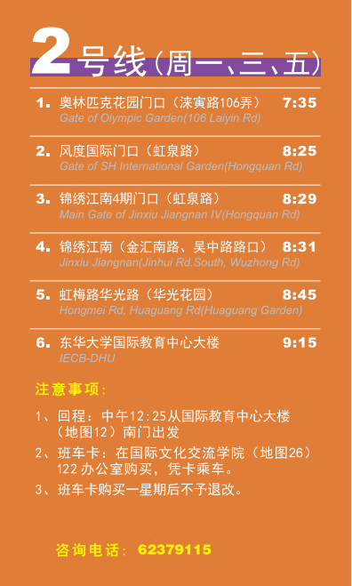 교외주숙 학생들이 통학하는데 편의를 드리기 위해 학부원에서는 룽바이, 구베이, 풍도국제, 치보우 완커 등 외국인이 집중 거주하는 지역에 셔틀버스 서비스를 제공하고 있습니다. 셔틀버스 비용은 300-500위안/학기 입니다.