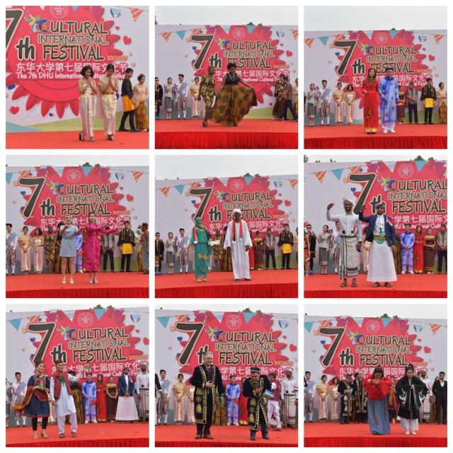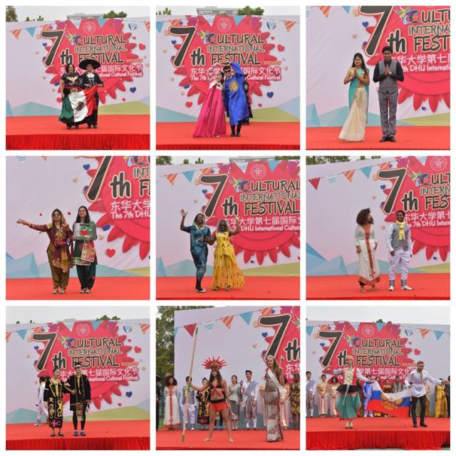 留学生们身着民族节日盛装,在各国展台前热情展示着服饰、图片、食品、手工艺品,让大家不出校门就能尽览五大洲风土人情:神秘的非洲木雕、韩国热气腾腾的泡菜饼、香喷喷的土耳其烤肉、马来西亚的小吃、墨西哥的玉米饼、巴基斯坦的手绘、乌拉圭的水晶、伊朗的藏红花、印尼的咖啡等等。中外师生和校友们流连于一个个眼花缭乱的展台,听着一句句洋腔洋调的汉语,在这里语言、肤色、国籍、年龄都不是交流的障碍,一个微笑、一个拥抱、一张合影,世界多彩文化在东华校园里交融。操场中间的舞台上来自世界各地的留学生纷纷献上本民族最精彩的节目,台下观众大饱眼福的同时忍不住也上台一起加入欢乐跳舞的队伍,现场热闹非凡。