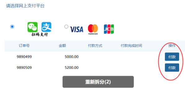 개인의 온라인 결제 한도 제한에 따라 특히 위챗이나 알리페이를 통해 목돈을 지불할 경우 온라인 결제 한도액을 초과하여 일시불 결제가 되지 않는 경우가 발생할 수 있습니다. 이때 '분할결제'를 선택할 수 있습니다.