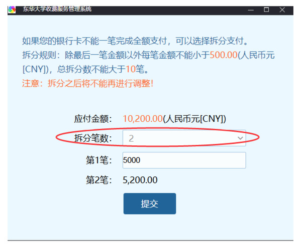 요구사항에 따라 팝업창에 선택한 분할 수와 해당 금액을 기입해 주세요. 시스템에서 자동적으로 두 번 결제하는 것으로 되어 있으나 만약 더 많은 분할 수를 선택하고 싶다면, 두 번째 상자에서 선택할 수 있습니다. 한 건당 지불할 금액을 설정하고 "제출"하시면 됩니다. 제출하고 나서 지불설정은 변경할 수 없습니다.