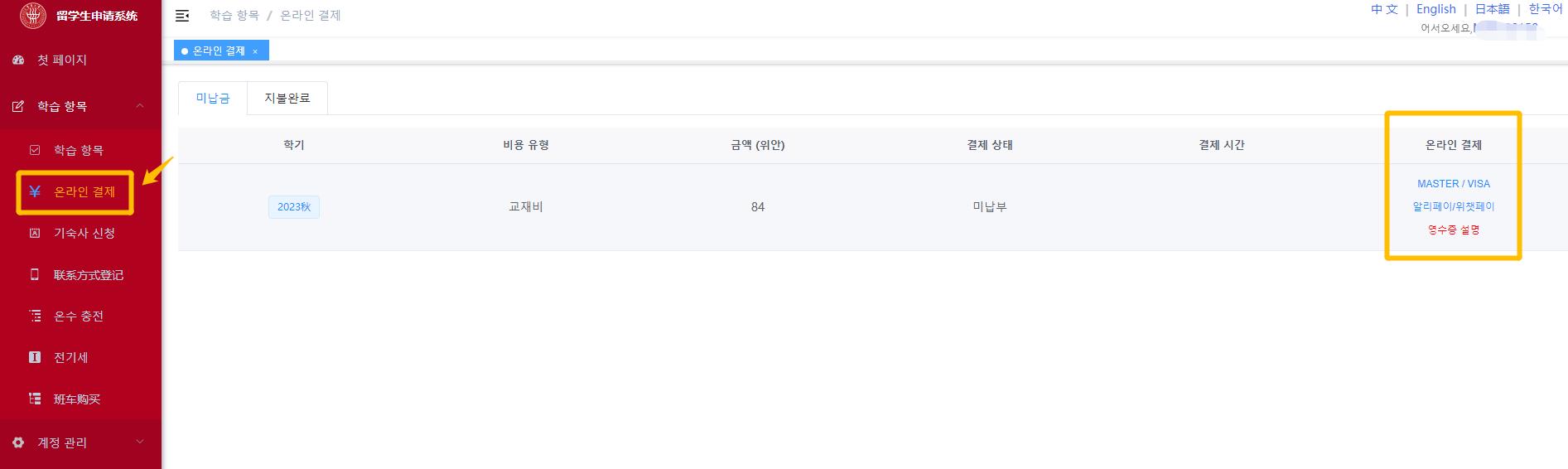 왼쪽의 “일시불” 결제 버튼을 눌러 학비 결제를 해주세요. 위챗,알리페이를 통해 큐알코드를 스캔하시면 지정된 결제 페이지로 넘어가니 결제를 완료해주세요
