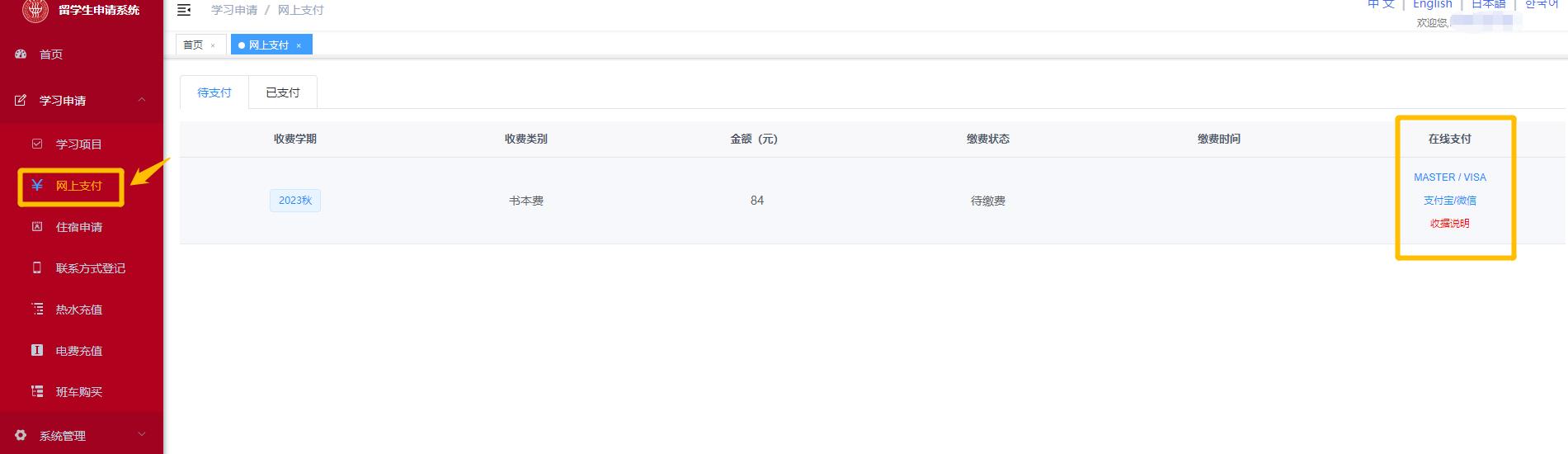 2: 点击“网上付费”,找到你需要支付的款项。请先阅读“收据说明”