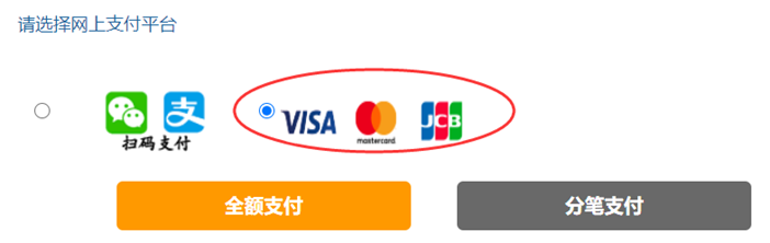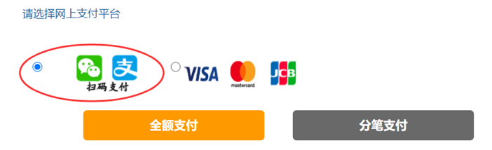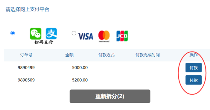 完成分笔设置后,请根据提示先选择付款方式(微信、支付宝、VISA/MasterCard,),确认付款方式后请点击蓝色“付款”按钮,并完成对应每笔付款。
