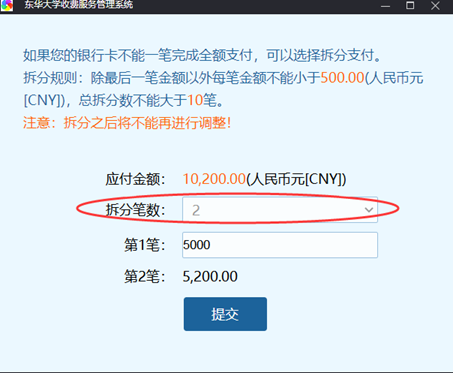 请根据要求在弹窗处填写你选择拆分的分笔数与对应金额。系统将默认你选择分两笔付款。如果你想选择更多拆分笔数,可以在第二个框中选择,并输入你希望的每笔付款金额。设置完每笔支付的金额并“提交”。一旦提交申请,支付设置将无法改变。