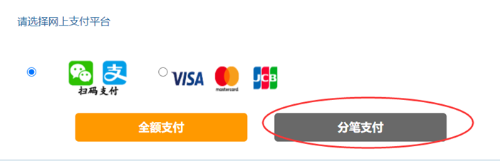 如果因为支付金额限制,你无法一笔支付相关费用。你还可以选择右侧“分笔支付”进行分笔支付。详细说明请见下文。